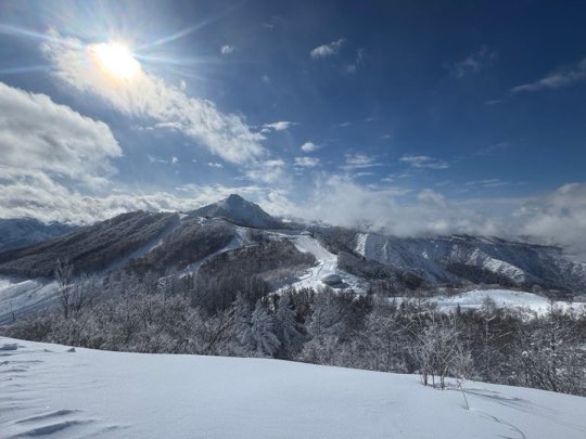 晴天。北の峰ゴンドラの上から登ると、まだパウダーは少し残ってます。が、ほんと少しですよ。数日、ほとんど降ってませんから。