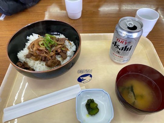 今日のお昼は南郷ロッヂでしか味わえないジンギスカン丼とビールです。